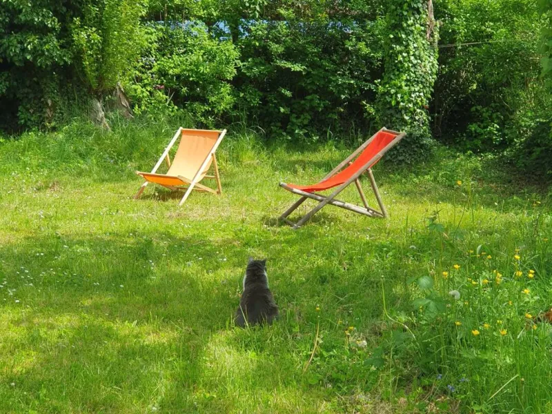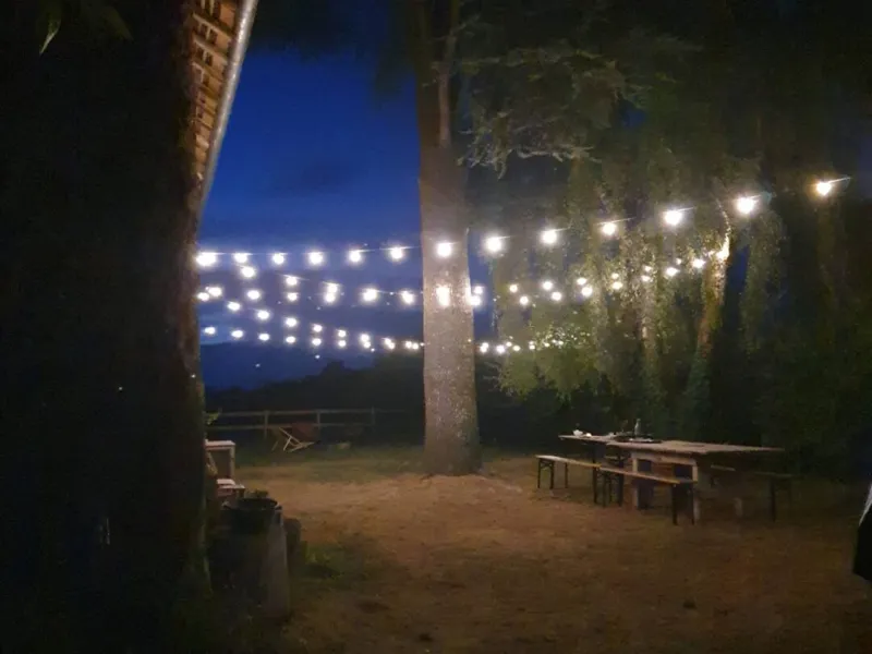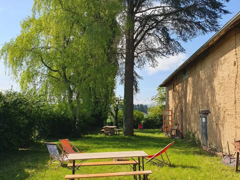 A l'extérieur : espaces arborés, mobilier extérieur, toilettes sèches et douche extérieure, dans un cadre relaxant et inspirant, avec un large panorama de la Dent du chat à la Chartreuse.
