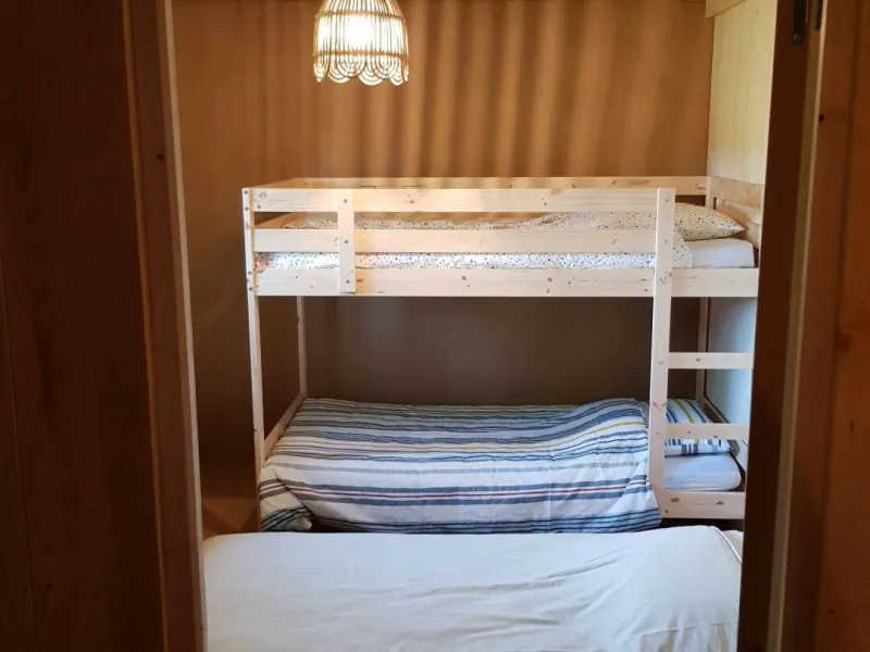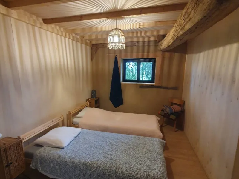 Au rez-de-chaussée : espace cuisine, pièce à vivre (canapé lit double) et sanitaires (2 toilettes sèches, 2 douches). A l'étage : 4 chambres (9 couchages, lits simples) pour une capacité totale de 11 couchages.