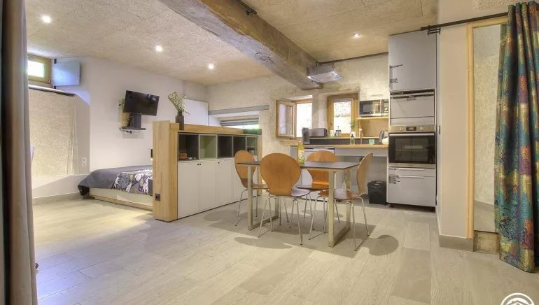 Connaissez vous le domaine de Cysaril au cœur d'un village de caractère ? Bienvenue Au pied du Grand Colombier, gîte pour 4 personnes. Ce grand studio de 41 m² est accessible aux personnes en situation de handicap. De nombreuses activités vous attendent. Lacs, marais, montagnes : vous serez séduits par des paysages naturels préservés, où il est facile de s'évader entre combes, crêts boisés, et magnifiques panoramas sur la chaîne des Alpes et le Mont Blanc. Vous êtes plutôt sportif ? Préparez-vous. Le col du Grand Colombier, col mythique à 1534 m d'altitude, vous promet de belles montées et des panoramas spectaculaires. Pour des activités plus douces, des sentiers balisés vous permettront de vous imprégner de la nature sauvage. Poursuivez votre découverte en vous immergeant dans les lacs environnants, comme le lac de Barterand, bordé de sculptures dans le rocher. Rafraîchissez-vous au bord des cascades de Cerveyrieu, Clairefontaine et Glandieu. Enfin, délectez-vous autour d'un bon repas et découvrez la gastronomie du pays de Brillat-Savarin. Découvrez maintenant votre gîte, situé en contrebas de la résidence des propriétaires. Vous êtes plutôt SPA ou sauna ? Préparez votre moment de détente (4 h chauffe pour le SPA). Et si vous mettiez ce temps à profit pour découvrir le refuge LPO ? Les propriétaires se feront une joie de vous l'expliquer. L'entrée de la maison s'ouvre sur la pièce principale : cuisine équipée, espace repas, un lit en 160*200 avec vue sur la cour couverte et deux lits en 90*200 escamotables. Salle d'eau avec WC accessibles. Espace buanderie. Une cour couverte sécurisée , orientée sud, offre 21 m² de détente et stockage de divers matériels (vélos, sacs à dos, chaussures randos). Prolongez vos moments en famille ou amis sur la terrasse extérieure privée de 42 m² privée. Voyagez léger : les lits sont faits à l'arrivée, le linge de toilette, maison, charges, sauna et spa compris. Ménage 40 € en option. Chauffage bois, parking intérieur.