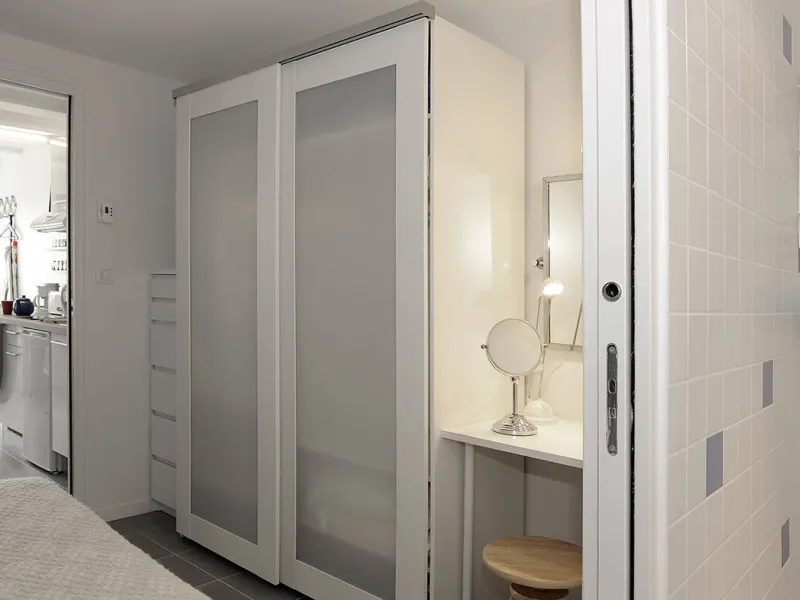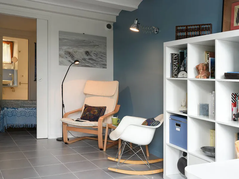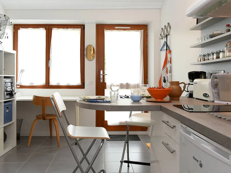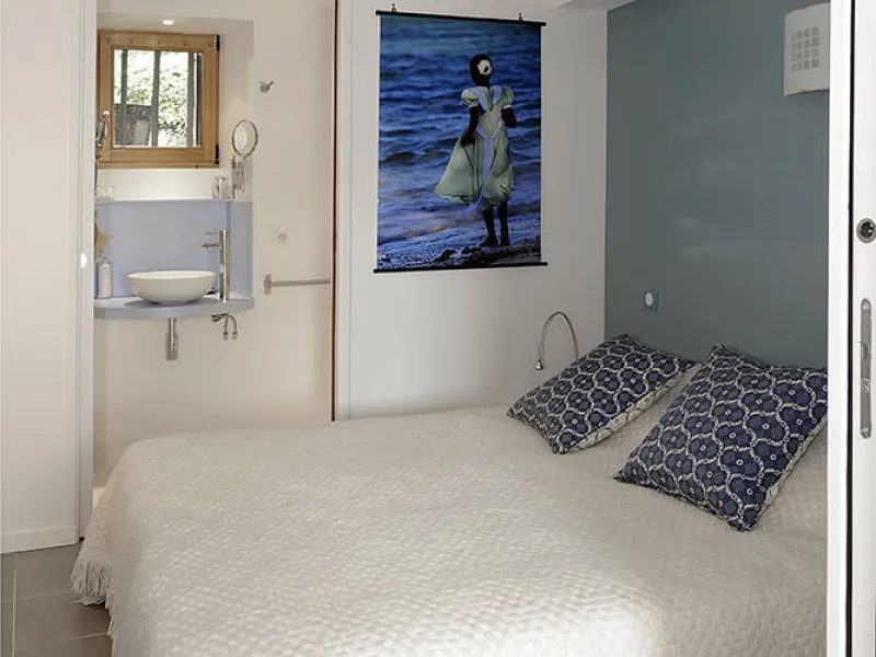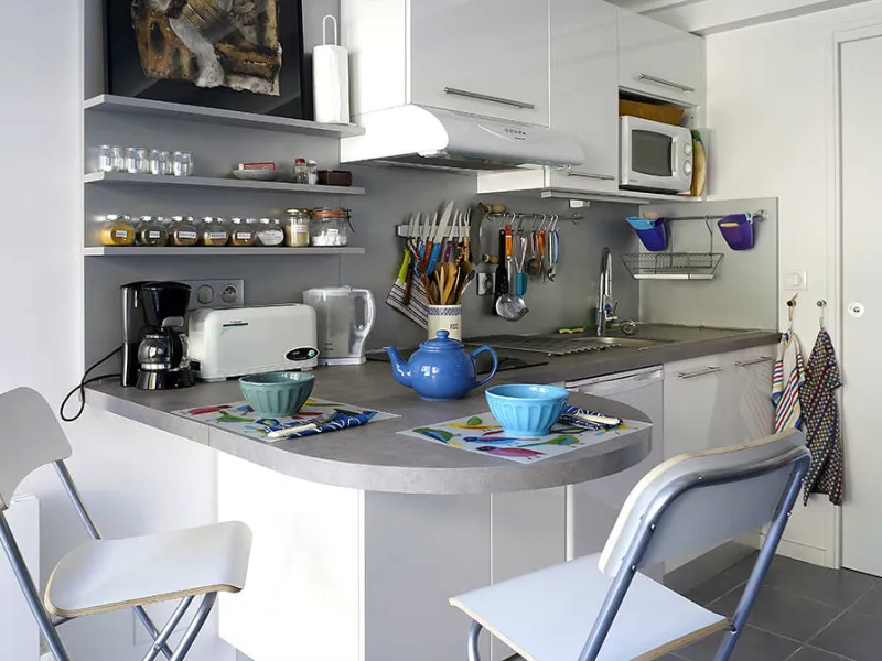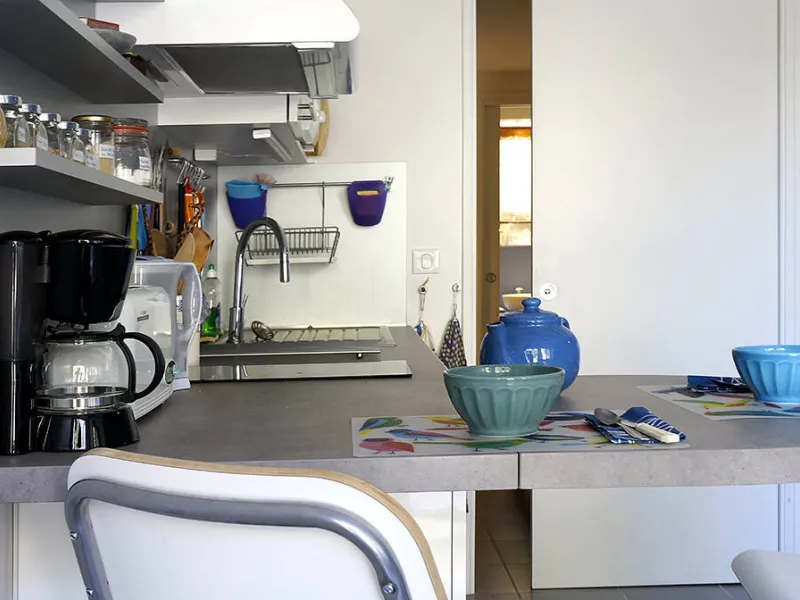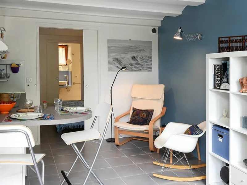 Un séjour/cuisine très bien équipée (plaque de cuisson induction, micro-onde, vaisselle/casseroles...) ; une bibliothèque avec quelques livres et jeux, un coin bureau.Une chambre avec 2 lits 80cm pouvant se relier et former un grand lit de 160cm, équipée d'une penderie/étagères, une coiffeuse avec miroir, sèche-cheveux et une commode haute.