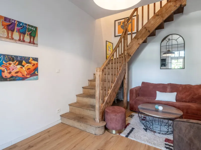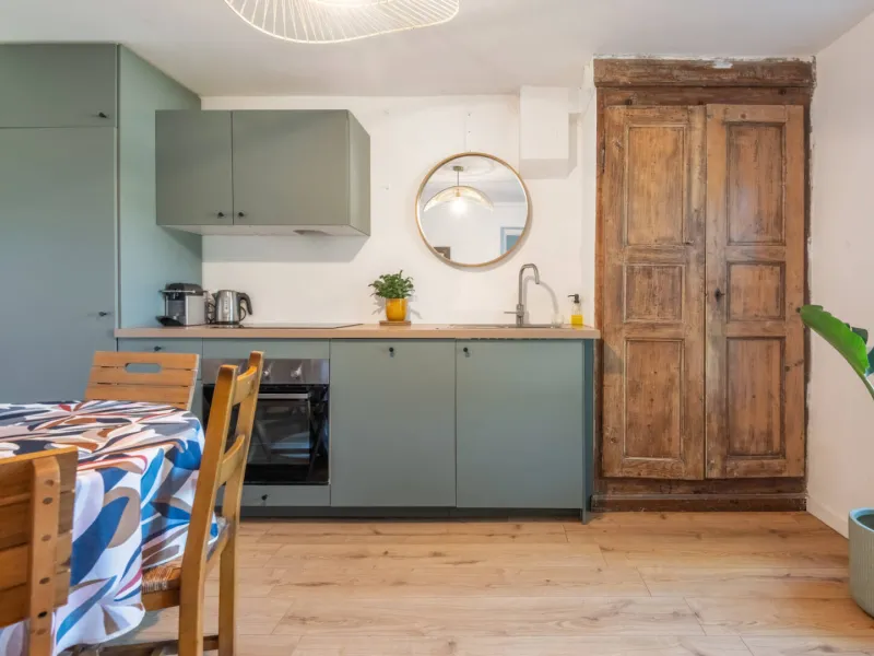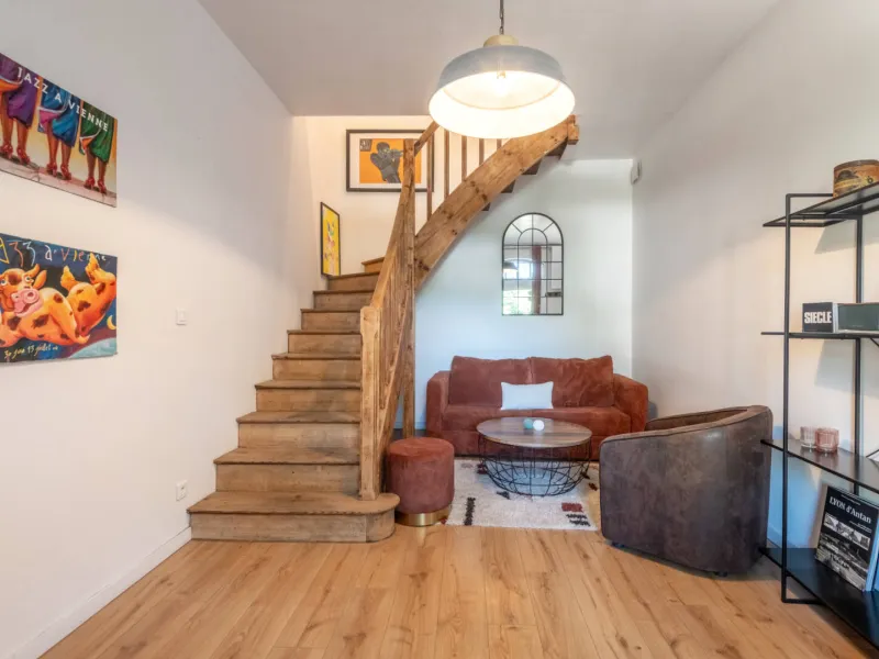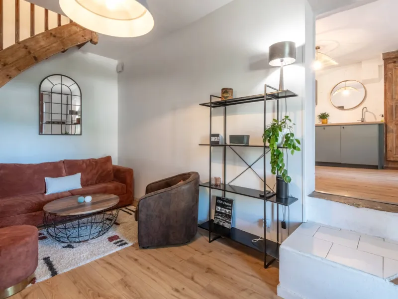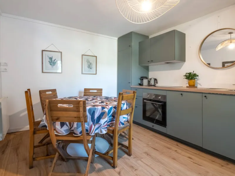 Rez-de-chaussée : salon cosy avec canapé convertible neuf, grande cuisine équipée et salle à manger conviviale.