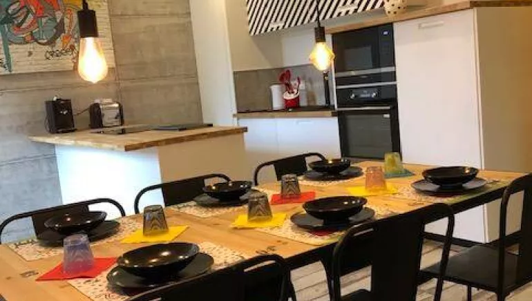 "Le Déjanté", grand duplex au 1er étage d'une bâtisse en pierre. Au 1er niveau, une salle de bain-WC avec baignoire, une cuisine ouverte entièrement équipée donnant sur une grande pièce à vivre et une chambre dortoir avec 4 lits simples. A l'étage une chambre parentale avec salle d'eau-WC donnant sur une vaste terrasse vous offre une magnifique vue sur le Grand Colombier et les Alpes.