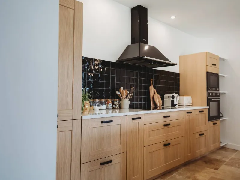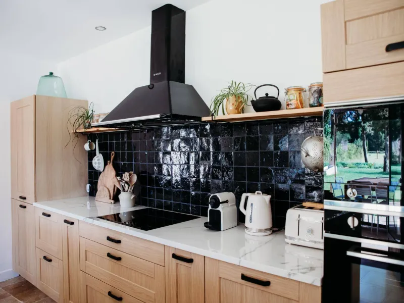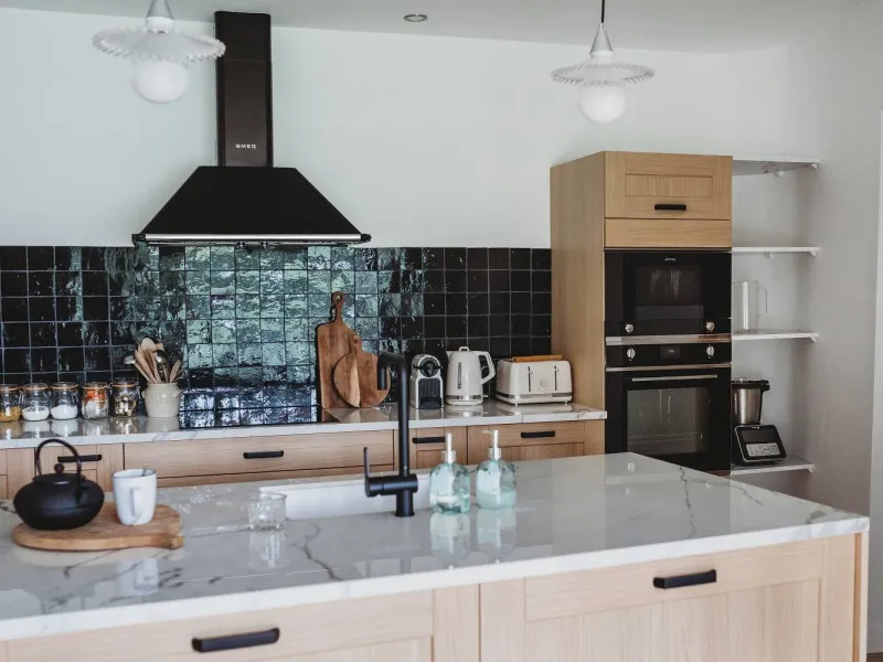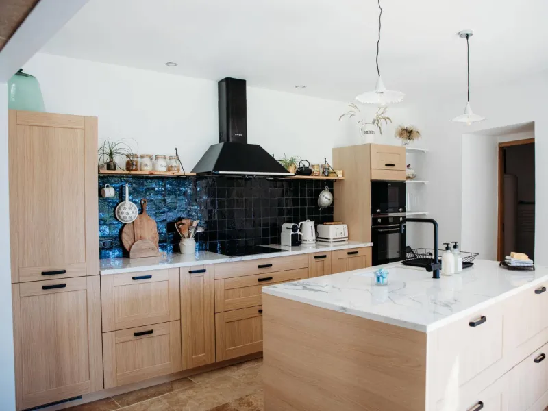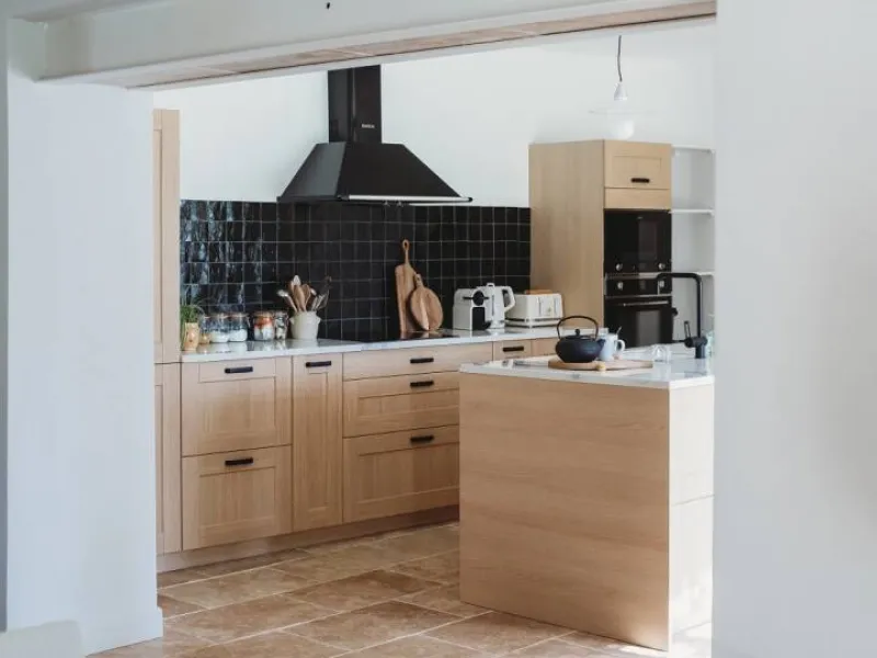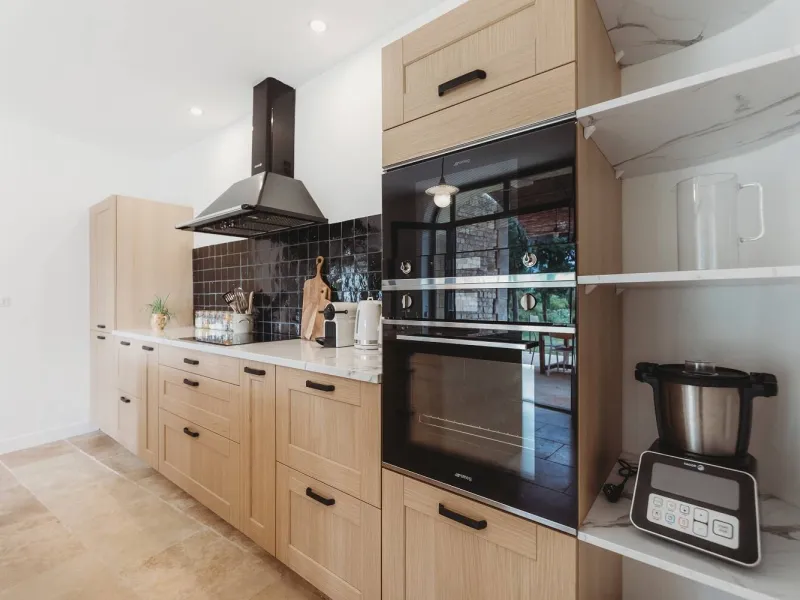- Cuisine équipée avec îlot central, réfrigérateur/congélateur, four, micro-ondes et lave-vaisselle.