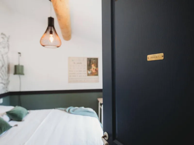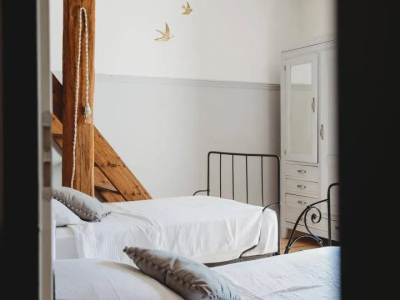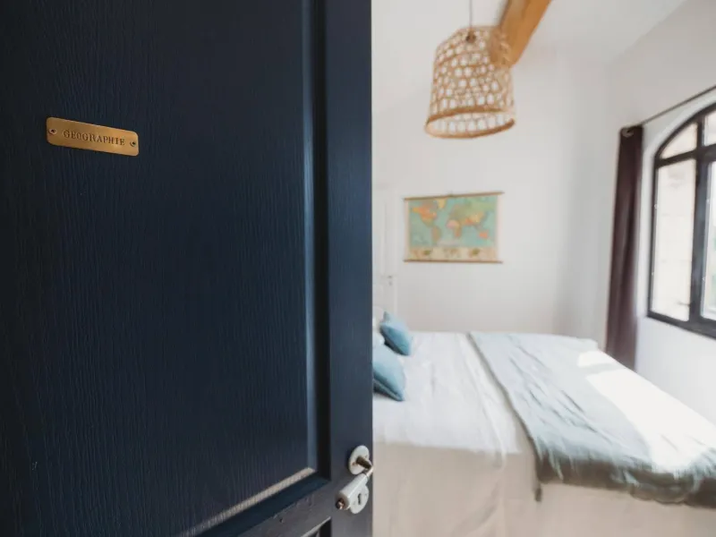 - Chambres Géographie et Histoire, équipées toutes 2 d'un lit 2 personnes 160x190cm et d'une salle d'eau avec vasque, douche à l'italienne et WC (WC indépendant dans la chambre Histoire).