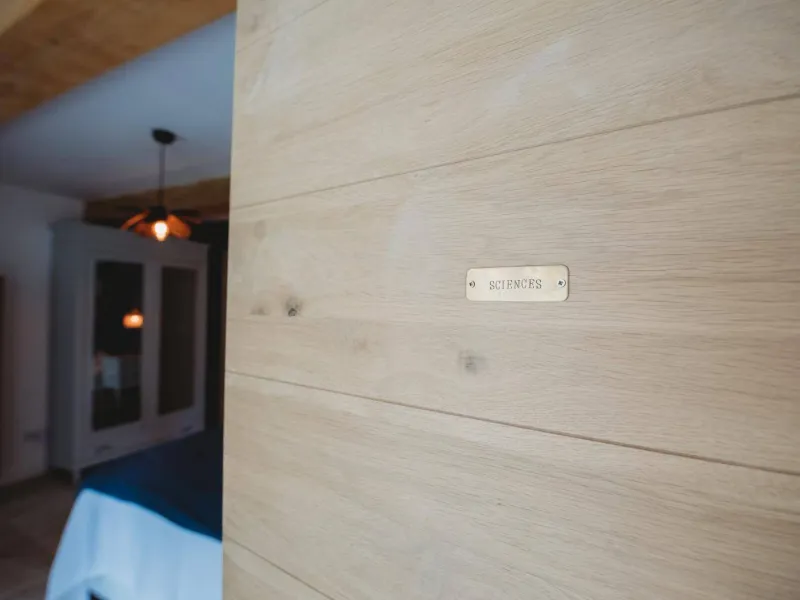 - Chambre Sciences de 18 m² avec 1 lit 180x200cm, salle d'eau attenante avec double vasque, douche à l'italienne et WC. A l'étage :