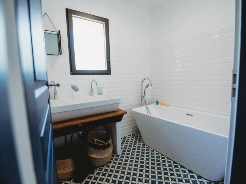 - Salle de bain avec baignoire et grande vasque profonde type école.