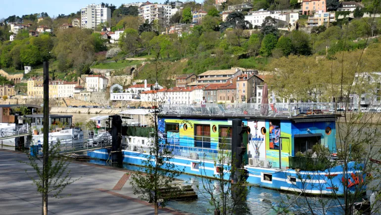 La péniche possède aussi une salle de réunion, une terrasse panoramique et un solarium avec vue sur la Saône.