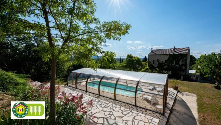 Piscine couverte (9m x 4m - 1,40m de profondeur) avec bains de soleil ouverte de mai à septembre