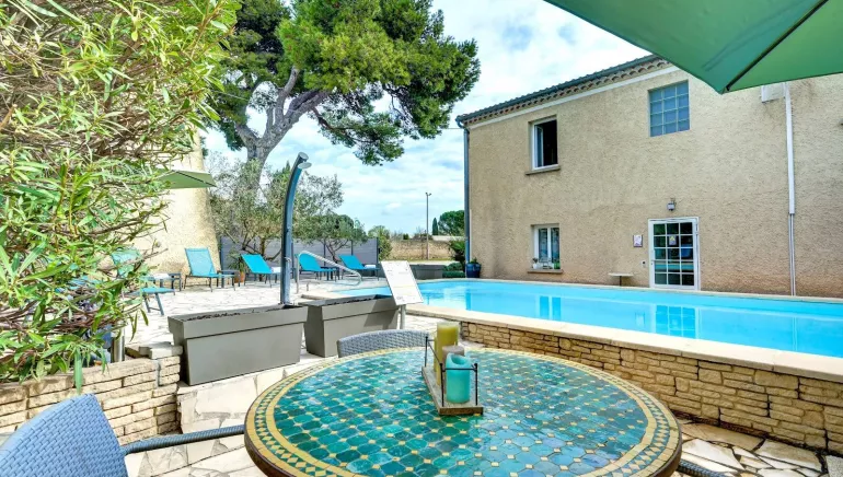 Le cœur du site : sa terrasse intérieure procure calme et repos, face à la piscine, idéal pour s’y installer en famille, en couple ou tout simplement se distraire après une journée de travail.
