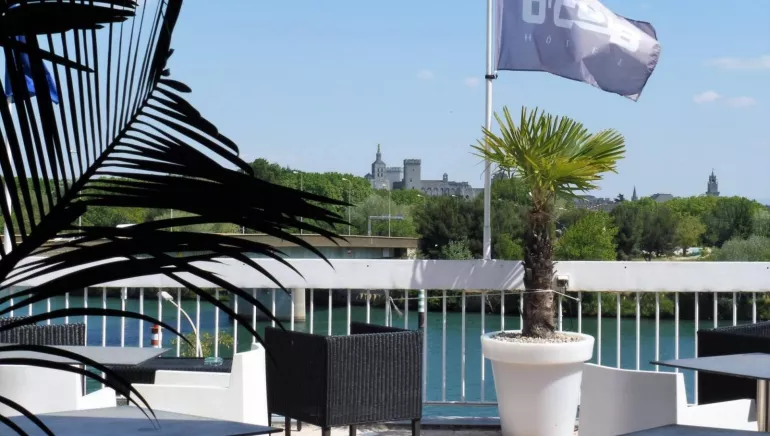 Une terrasse offre une vue panoramique sur le Rhône et la cité des Papes.