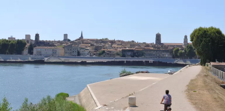Depuis le port de Beaucaire, suivre l’itinéraire par le chemin de Saint-Joseph puis le chemin des abattoirs sur routes goudronnées à travers les quartiers Sud de la ville. Passés ces 1,5 kilomètres, on retrouve la voie cyclable en enrobé récemment aménagée sur la digue en rive droite du Rhône. Aménagements de confort (bancs, tables, RIS) le long de la voie. Passage avec pied à terre au niveau du franchissement du barrage de la prise d’eau au Rhône. Poursuite sur la digue jusqu’à Fourques avant le franchissement du pont suspendu sur le Petit Rhône et l’entrée dans Arles par le quartier de Trinquetaille.