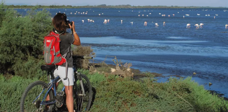 La boucle de 44 km entièrement plate, utilise des routes départementales peu fréquentées et permet la découverte des étangs de Camargue.