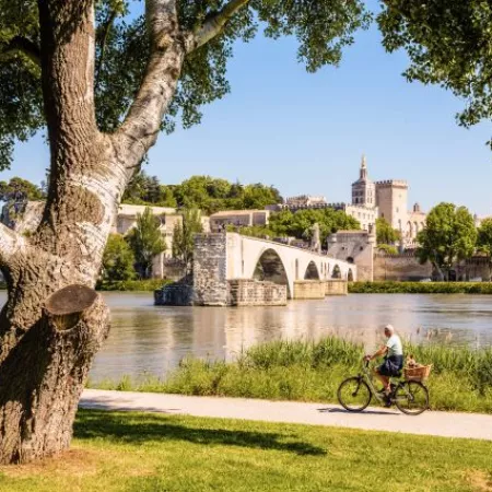 Un séjour à vélo accessible à tous au départ d’Avignon ; en seulement quatre jours, vous parcourez les Alpilles – Saint-Rémy de Provence, les Baux de Provence – avant d'atteindre Arles, point de départ de votre excursion en Camargue sur la Via Rhôna. Un véritable dépaysement entre paysages de lavande et d’oliviers, histoire antique, saveurs provençales et villages incontournables baignés de soleil.