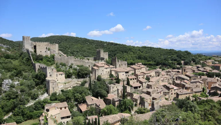 Le château fort, construit sur l'éperon rocheux du rocher de l'Agache, va constituer le point de départ du bourg actuel. Il était impossible de concevoir un village autour de l'église San Samonta, la configuration du terrain ne s'y prêtant pas. Selon l'état actuel des recherches archéologiques, nous savons que le bâtiment primitif était le bâtiment central actuel construit au XIIème siècle. Puis au XIVème siècle, le château s'est agrandi vers la crête avec de nouvelles constructions ayant une vocation résidentielle. Au cours des siècles, l'habitat s'est développé sur les pentes rocheuses que domine le château. Au fur et à mesure de ces extensions, les remparts ont été agrandis pour assurer la protection des maisons. Dans le courant du XVème siècle, le bourg castral atteindra les berges des deux ruisseaux, englobant la chapelle du castrum : sa superficie totale est de 2 hectares. Il sera entouré alors d'une importante enceinte tracée très régulièrement, qui existe en majeure partie encore aujourd'hui. On y pénètre encore par trois portes principales dont les derniers remaniements datent du XVème siècle. La famille ayant le patronyme " De Saint-Montan " pourrait être à l'origine du château (mention écrite dès 1110). Cependant, dès la fin du XIIème siècle, Saint-Montan est une coseigneurie.