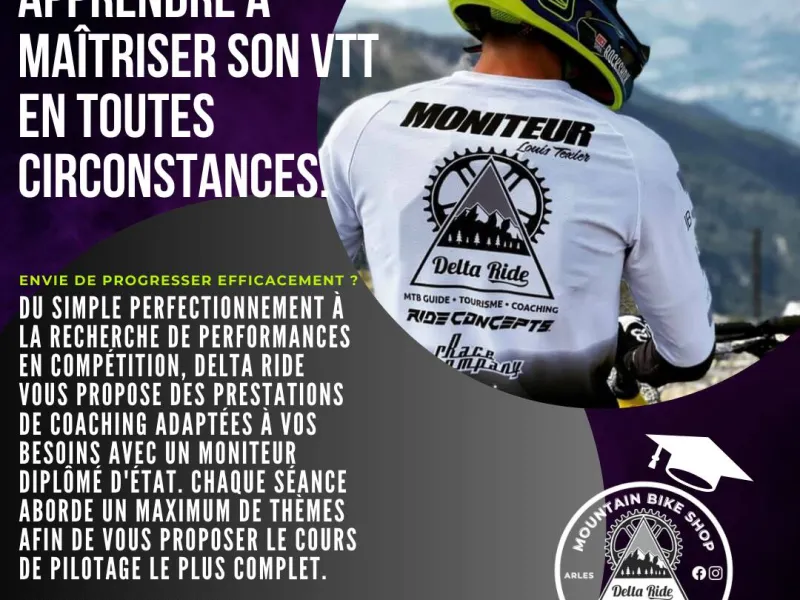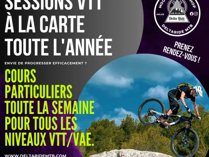 Vous souhaitez participer à une sortie sportive alliant découverte du patrimoine et VTT/VAE ? DeltaRide vous propose une sortie à la journée passant par les plus beaux itinéraires du massif des Alpilles et de la Camargue . Vous découvrirez la cité médiévale des Baux-de-Provence, le Lac des Peiroou à Saint Rémy de Provence, les Carrières de lumières et les Moulins de Fontvieille. Ne perdez plus votre temps à étudier le meilleur itinéraire, je serai votre guide pour une expérience cyclotouristique unique ! Du simple perfectionnement à la recherche de performances en compétition, Delta Ride vous propose des prestations de coaching adaptées à vos besoins avec un moniteur diplômé d'état. Chaque séance aborde un maximum de thèmes afin de vous proposer le cours de pilotage le plus complet. Virages en épingles, sauts, freinage, conservation de la vitesse, études des trajectoires, position sur le vélo, passages très techniques, Delta Ride vous permettra de vaincre vos appréhensions et de progresser sur votre VTT/VAE. Découvrez en détail toutes mes prestations sur : www.deltaridemtb.comCet établissement vous intéresse ? Rendez-vous sur leur site pour réserver ou en savoir plus.