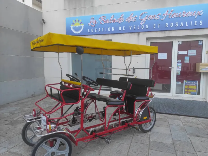 Location de vélo : Cruiser, VTC, VTT, VAE (vélo à assistance électrique), tandems, vélo enfant (12 au 24 pouces)...Location de Rosalies de 2 à 6 places (+2 enfants de - 120 cm).