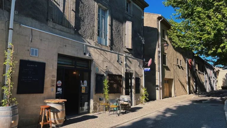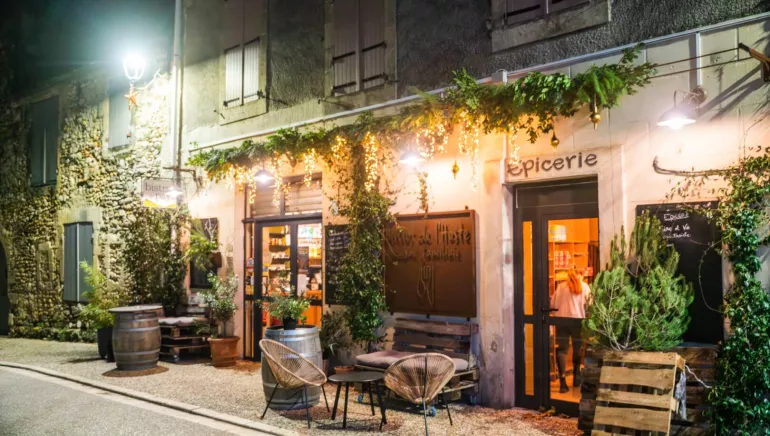 Le bistrot ne compte pas une, mais deux terrasses ombragées ! La première, située devant le bistrot, est typiquement provençale avec sa jolie fontaine à l’ombre des platanes. Face à la mairie, elle vous permettra de ressentir l'âme du village tout en écoutant le doux murmure de l'eau... La dolce vita est à portée de main. La seconde se trouve dans le charmant patio. Vous pourrez y déguster un verre de vin en toute quiétude ou savourer un repas tout en vous imprégnant de l'atmosphère italienne qui se dégage des murs ocre. L’intérieur, entièrement rénové, dévoile de superbes moulures, des luminaires maison et une création unique : un mur de 3000 bouchons de liège signé Thomas, qui trône derrière le bar. La famille a su préserver et rajeunir le comptoir datant de 200 ans, rappelant le charme des bistrots d'antan.