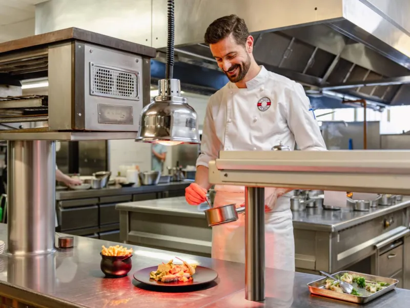 Découvrez des spécialités de viandes et poissons grillés, ainsi que des entrées et plats à la carte, élaborés avec soin et avec des produits de saison.Savourez le menu Évasion à 32 €, comprenant entrée, plat et dessert, renouvelé chaque semaine par le Chef et sa brigade.
