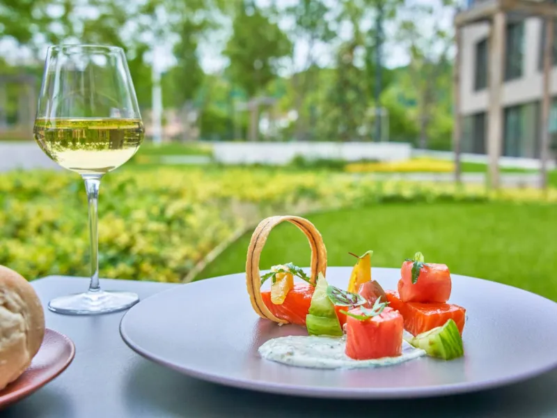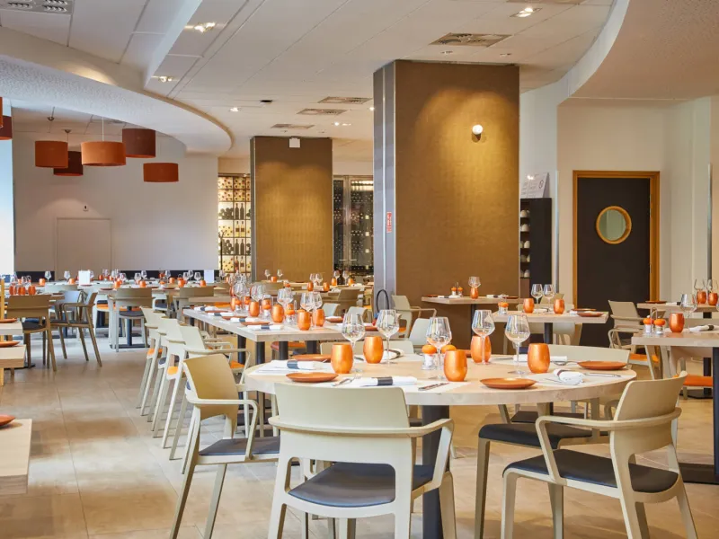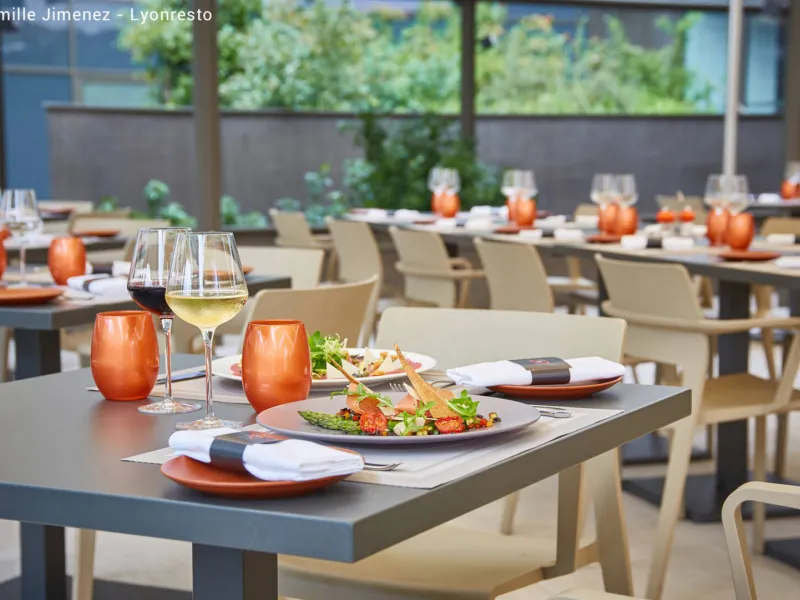 Déjeunez ou dînez dans la salle intérieure moderne et chaleureuse ou sur la terrasse extérieure ombragée et cosy avec vue la Saône aux beaux jours.