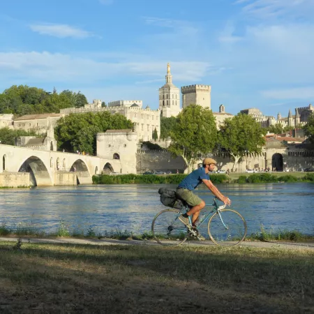 Des villes chargées de l’histoire gallo-romaine jalonnent le fleuve, tandis qu’autour, de célèbres vignobles déroulent leurs coteaux ensoleillés. Valence, Ville d’Art et d’Histoire, ouvre les portes du Midi. L’air, chargé de l’odeur des champs de lavande qui fleurissent en juin et juillet, commence alors à chatouiller les narines. Doucement, on se dirige vers la Provence et les cités historiques de Viviers, de Châteauneuf du Pape et d’Avignon. C’est un Rhône sauvage qui serpente à travers les vergers et les cultures méridionales. ViaRhôna arrive alors à Avignon, capitale de la Chrétienté au Moyen-âge. Avignon a gardé de son Histoire un patrimoine d’exception dont une grande partie est inscrite au Patrimoine Mondial de l’Unesco, tel le Palais des Papes et le Pont.